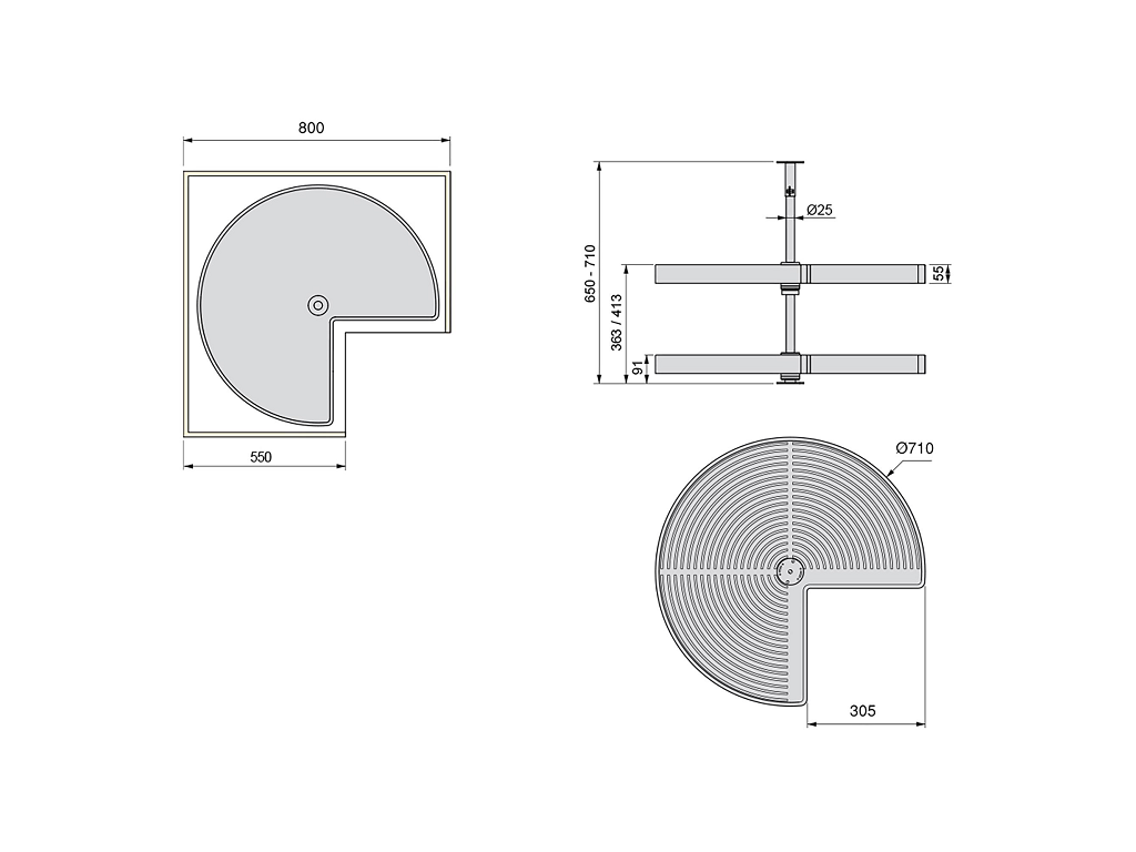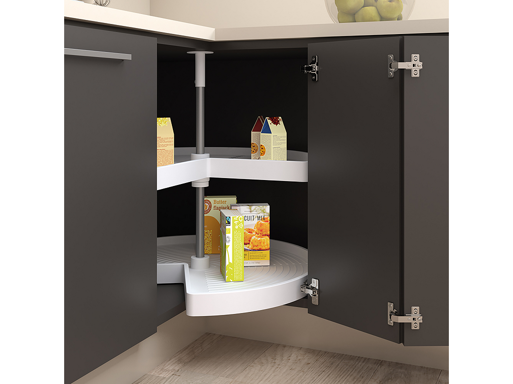 Cestelli girevoli tre quarti progettatiper ottimizzare lo spazio in moduli ad angolo di cucina a forma di L. Sonofacili da installare e adattabili a diverse altezze dei moduli. Sonodisponibili per misure di moduli da 800 mm e 900 mm e finiture bianche e grigie.Il sistema è composto da due vassoi e accessori di montaggio in plasticariciclabile, antistatico, ad alta resistenza agli urti e ai raggi ultraviolettie una barra centrale in alluminio anodizzato opaco. Hanno una capacità dicarico di 20 kg per vassoio.