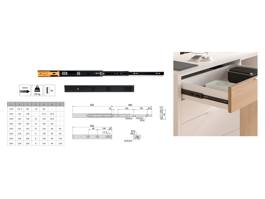 Home Ferramenta Funzionalità del Mobile Guide per Cassetto Guide per Cassetto con Cuscinetti a Sfere GUIDE CON SFERE PER CASSETTO ESTRAZIONE TOTALE SOFT 45×12,7h PORTATA kg.35 NERO VARIE LUNGHEZZE | EMUCA