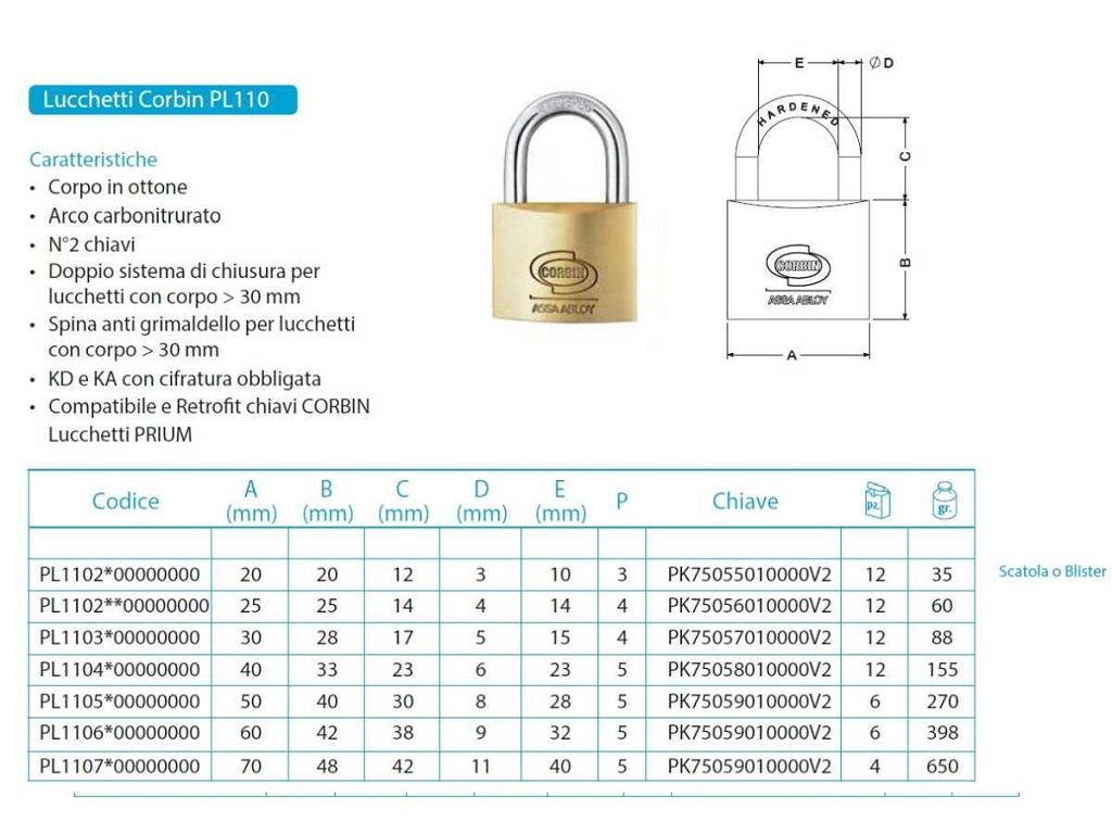 Lucchetto Arco Tondo Corpo Rettangolare Ottone mm.25   Corbin