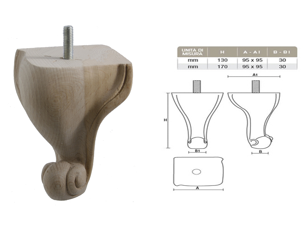 Piede in legno di faggio grezzo con vite filettata MA10x30 marca GPI